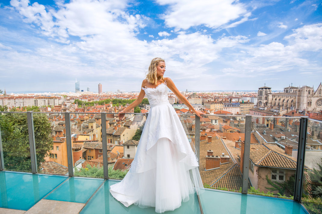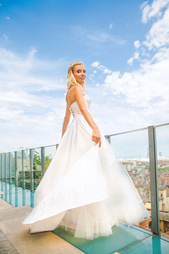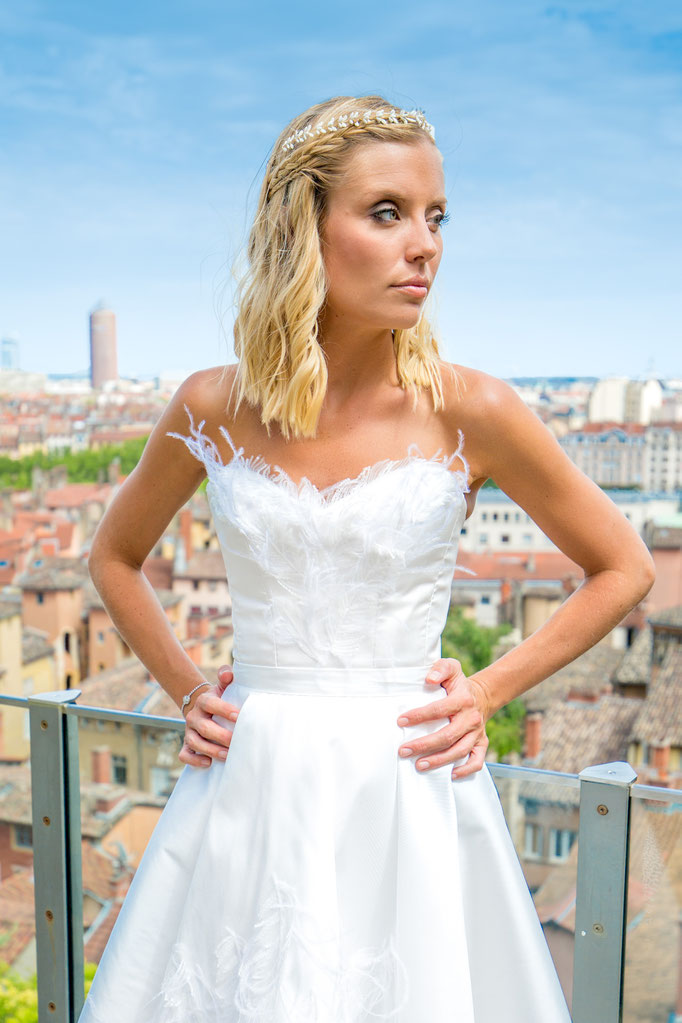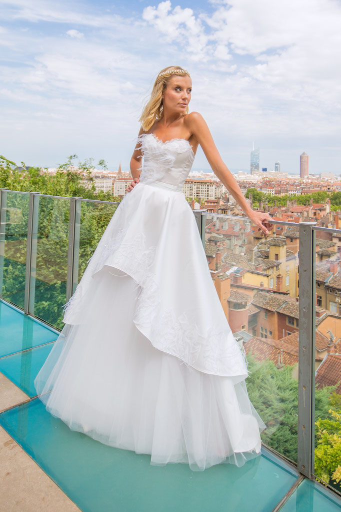 Robe longue en mikado et tulle souple, avec bustier corseté intégré. Broderies de sequins forme plume et plumes d'autruche