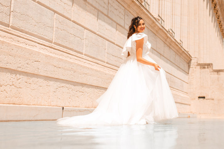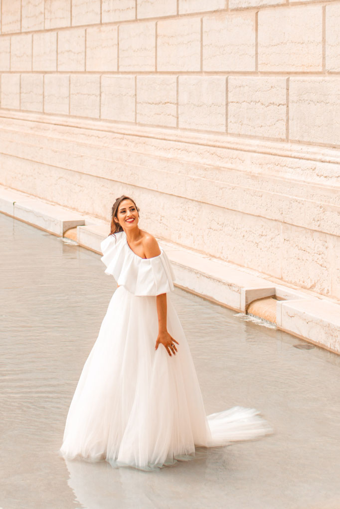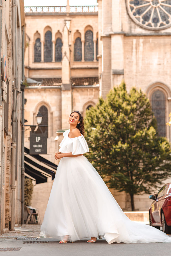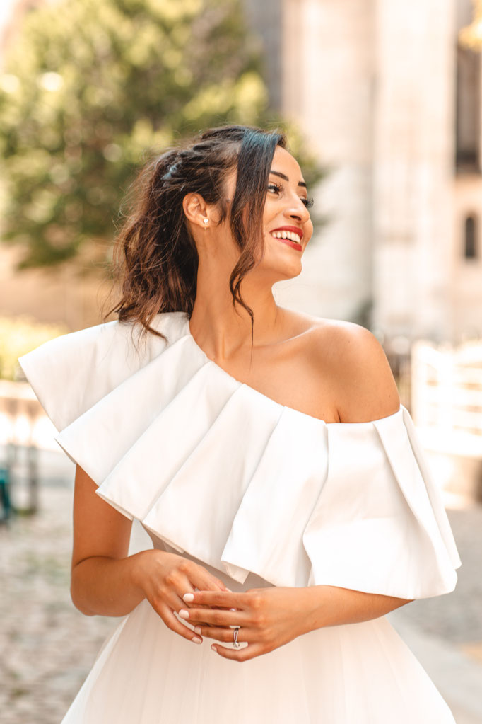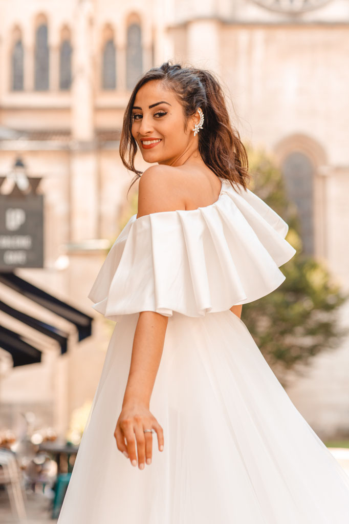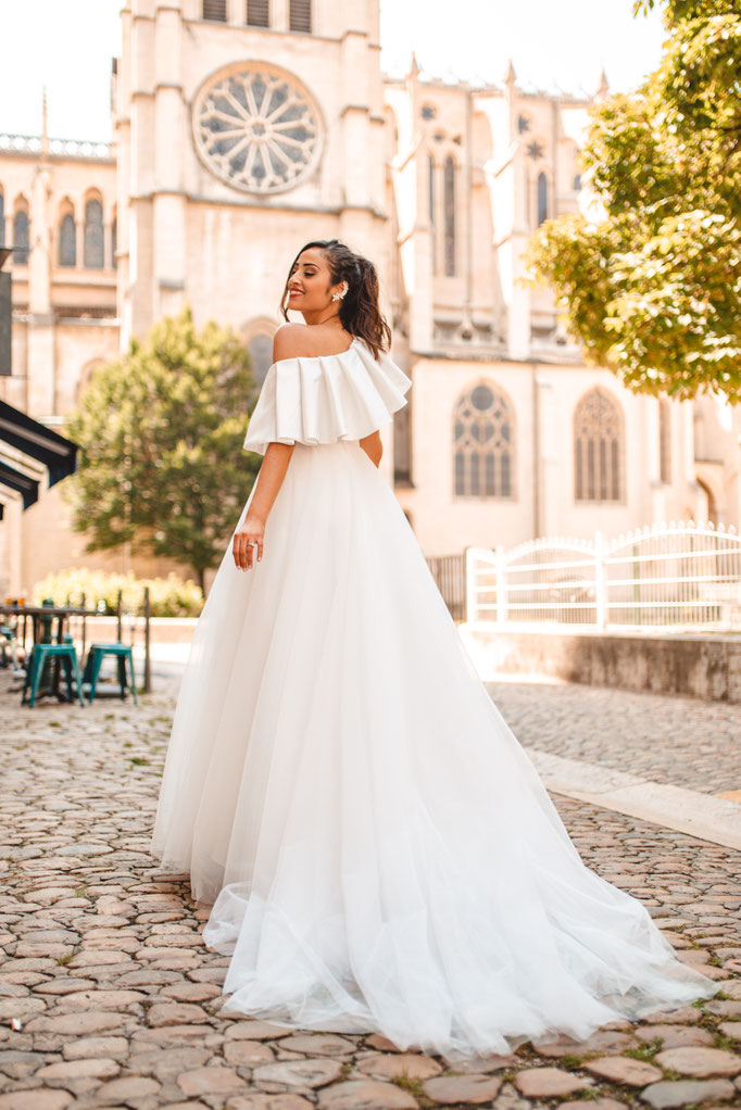 Robe coupe princesse en tulle souple avec son léger jupon intégré, effet asymétrique one-shoulder, mikado plissé