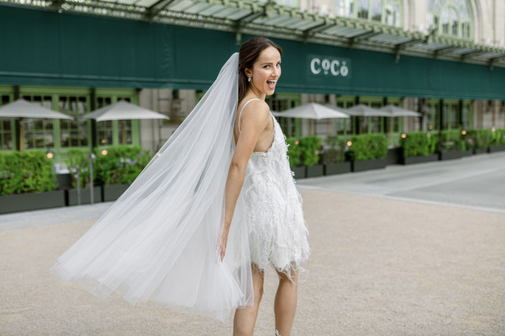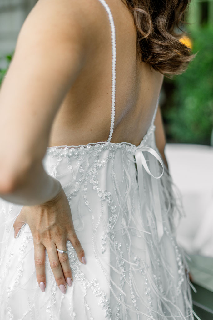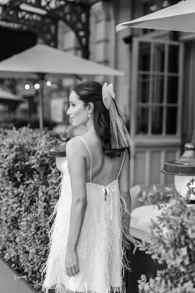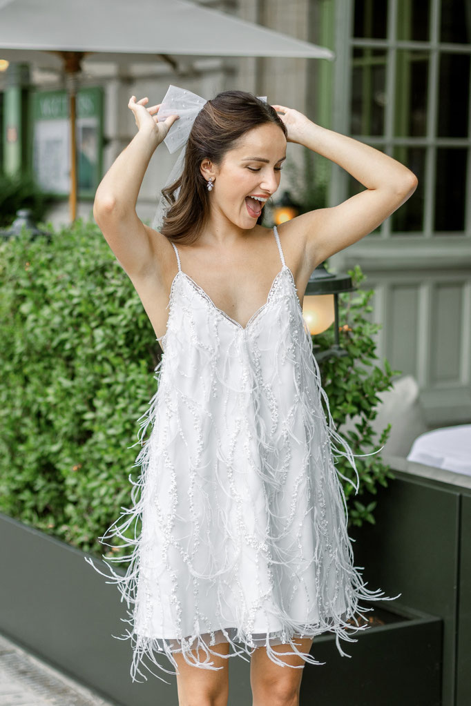 Robe courte coupe trapèze en tulle brodé perlé, détail plumes, bretelles fines perlées, fermeture dos petit noeud Serre-tête perlé à la main